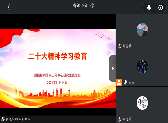 为深入学习贯彻党的二十大精神,推动研究生党员学思践悟、知行合一,强化使命担当,凝聚奋斗力量,11月14日,材料学院磨损控制国家工程中心研究生党支部通过线上会议开展了“砥砺奋进新征程 勇毅前行作表率”主题党日活动。活动由支部书记郑鑫园主持,支部全体成员参加。